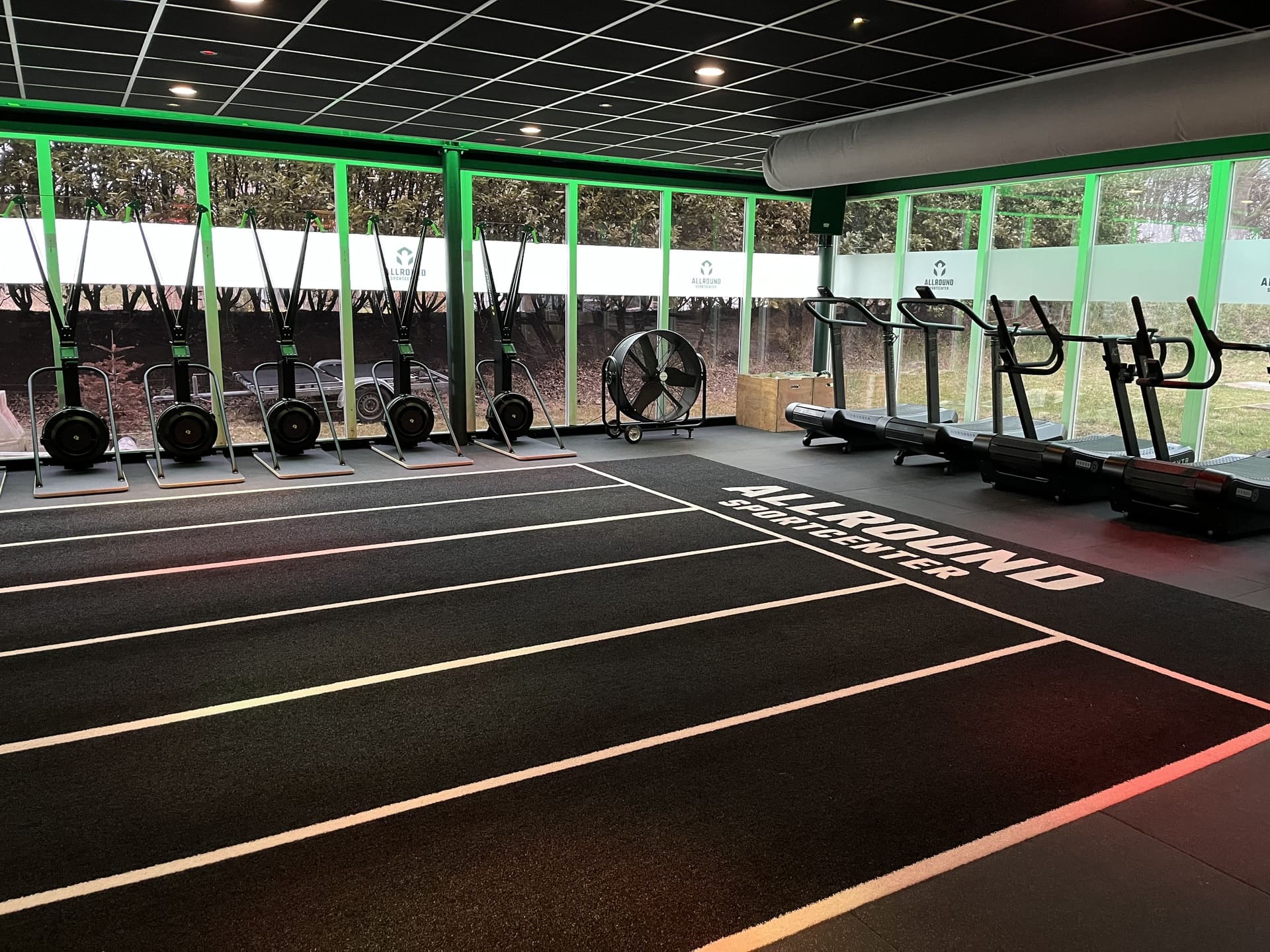 Centro fitness di lusso ad Albstadt, in Germania. Manto erboso sintetico nero realizzato su misura, con linee di partenza ricamate e corsie numerate.